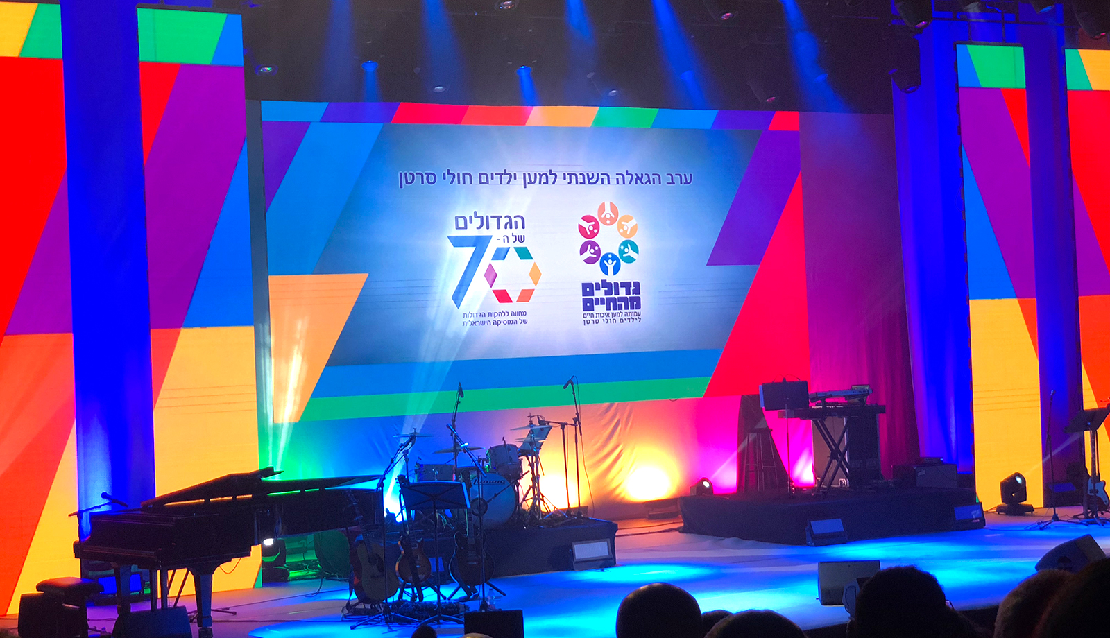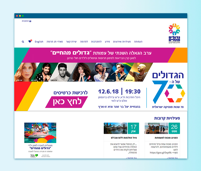 עמותת גדולים מהחיים פועלת לשיפור איכות חייהם ורווחתם של ילדים חולי סרטן ומשפחותיהם ללא הבדל דת, לאום או מין, מרגע גילוי המחלה ועד להחלמה. אירוע גיוס התרומות השנתי של העמותה, שנערך במקביל לחגיגות ה-70 למדינה, הוקדש לשירים הישראלים האהובים מכל הזמנים תחת הכותרת "הגדולים של ה-70". את הלוגו לאירוע עיצבנו בהשראת סמל השבעים למדינה, והמשולשים הצבעוניים המרכיבים את מגן הדוד שבו משמשים כמוטיב ויזואלי חוזר בעיצוב הקמפיין.
