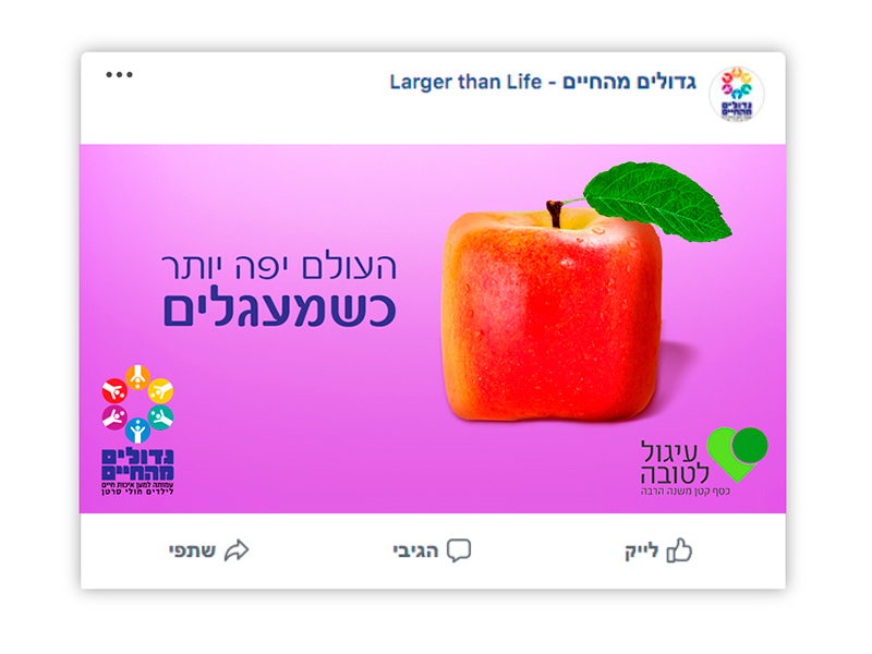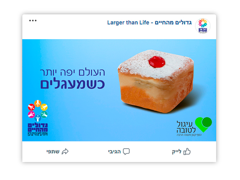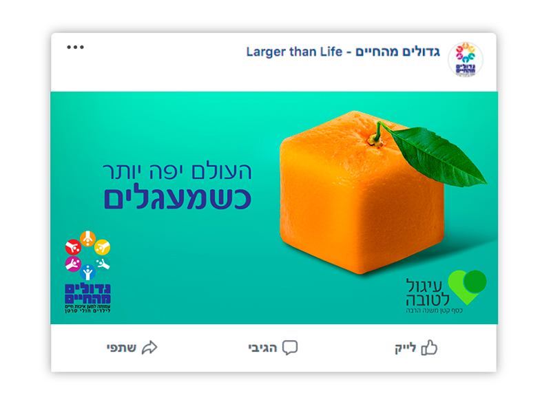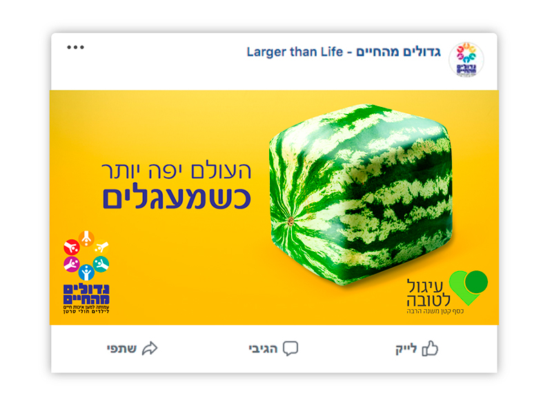 פרויקט עיגול לטובה אפשר למשתמשי כרטיסי אשראי לעגל את הסכומים אותם הם משלמים כלפי מעלה ולתרום את סכומי העיגול לטובת עמותה חברתית אותה בחרו. עמותת גדולים מהחיים בחרה בנו לעצב את קמפיין גיוס התרומות שלה במסגרת הפרויקט. הקונספט בו בחרנו היה להראות כמה העולם טוב יותר כשמעגלים – חפצים מוכרים ואהובים הידועים בצורתם העגולה הוצגו בצורת ריבוע, דבר שיצר תחושת דיסהרמוניה אצל הצופה, שהובילה להבנה שעיגול הוא טבעי וטוב.